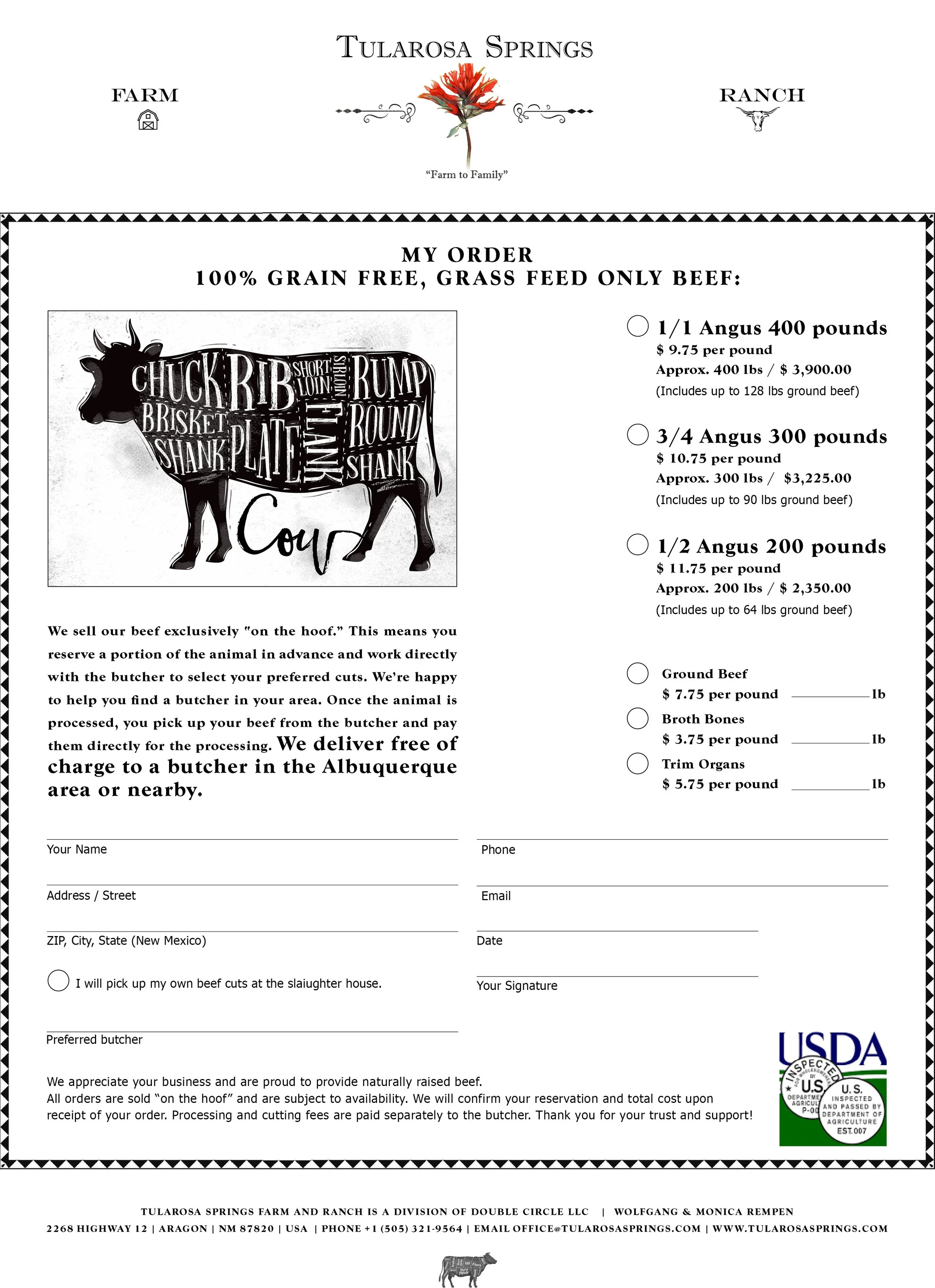 We sell our beef exclusively “on the hoof.” This means you reserve a portion of the animal in advance and work directly with the butcher to select your preferred cuts. We’re happy to help you find a butcher in your area.